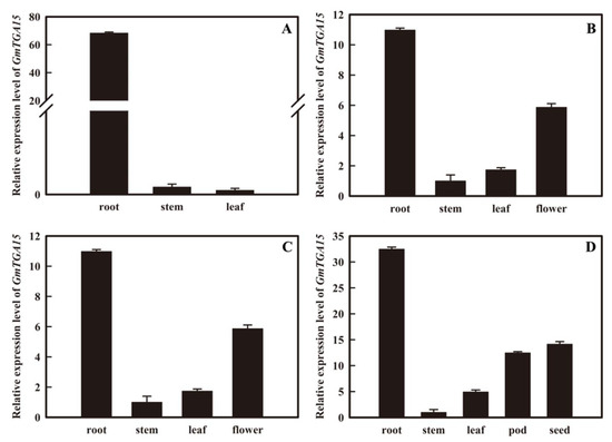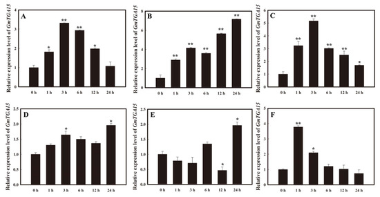 3.1. Expression Patterns of GmTGA15 under Abiotic Stresses and Hormone Treatments