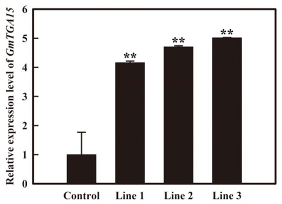 Chen, Z.; Fang, X.; Yuan, X.; Zhang, Y.; Li, H.; Zhou, Y.; Cui, X. Overexpression of Transcription Factor GmTGA15 Enhances Drought Tolerance in Transgenic Soybean Hairy Roots and Arabidopsis Plants. Agronomy 2021, 11, 170. https://doi.org/10.3390/agronomy11010170