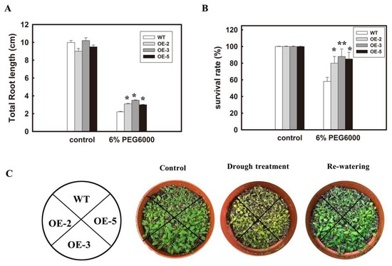 3.3. Overexpression of GmTGA15 Improved the Drought Tolerance in Transgenic Arabidopsis Plants