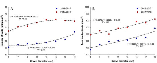 The number of fruits per plant (A) and the total production (B) of strawberry plants cv. ‘Pircinque’, according to different plant crown diameters (5, 7, 9, 11, 13, 15, 17, and 19 mm) in the 2016/2017 and 2017/2018 production cycles.