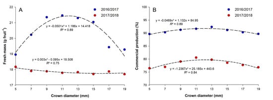 The response of fresh fruit mass (A) and the percentage of production classified as commercial (B) of strawberry plants cv. ‘Pircinque’, depending on different plant crown diameters (5, 7, 9, 11, 13, 15, 17, and 19 mm) in the production cycles 2016/2017 and 2017/2018.
