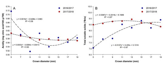 For the soluble solids content, quadratic increases were observed when using larger plants, but with different intensities, for the two analyzed harvests (Figure 4B). In the 2016/2017 production cycle, the maximum estimate for the sugar concentration (9.2° Brix) was obtained with the diameter of 17.9 mm. In the 2017/2018 harvest, the maximum content of soluble solids (9.3° Brix) was obtained with the plant diameter of 11.6 mm. The soluble sugar content in fruits is due to several polysaccharides from the photosynthesis process, mainly glucose, fructose, and sucrose. During fruit ripening, the production and concentrations of these compounds increase, and the reserve starch is converted into simple carbohydrates, which are soluble in water []. This is a possible explanation for why more vigorous plants resulted in sweeter fruits in the present study, highlighting the importance of having plants with an excellent physiological quality and high crown caliber, as well as those that are richer in terms of the carbohydrate reserve [].