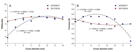 The response of the ratio between the content of soluble solids (TSS) by titratable acidity (A) and pulp firmness (B) of the fruits of strawberry plants cv. ‘Pircinque’, depending on different crown diameters of the plants (5, 7, 9, 11, 13, 15, 17, and 19 mm) during the 2016/2017 and 2017/2018 production cycles.