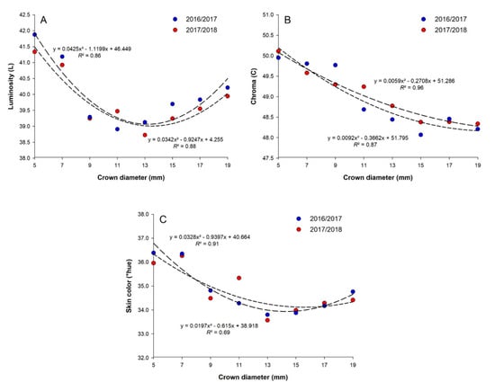 The response of the parameters related to the fruit’s epidermis coloration, represented by the values of luminosity (A), chroma (B), and the skin color (°hue) (C) in strawberry plants cv. ‘Pircinque’, depending on different plant crown diameters (5, 7, 9, 11, 13, 15, 17, and 19 mm) in the 2016/2017 and 2017/2018 production cycles.