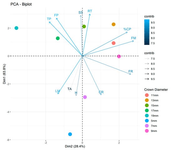 Principal component analysis of the variables in the study concerning the effect of bare-root plants with different crown diameters (5, 7, 9, 11, 13, 15, 17, and 19 mm) on the production and fruit quality parameters of strawberry plants cv. Pircinque. Caption: FP = fruits per plant; TP = total production; FM = fresh mass; % CP = commercial percentage; SS = content of soluble solids; FR = firmness; TA = titratable acidity; RT = soluble solids/titratable acidity ratio; LM = epidermis luminosity; CR = epidermis chroma; and H = epidermis hue angle.
