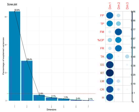 As a multivariate analysis modality, the analysis of main components is a handy tool in agricultural research in terms of identifying the most recommended treatments, taking into account the largest number of possible variables []. Therefore, this type of analysis often supports more precise conclusions being drawn from a research project’s result than the exclusive use of univariate analyzes, which often leave doubts in terms of the most effective treatments measurement []. This can be especially important in the case of a crop such as strawberry, in which the yield and fruit quality parameters are equally relevant [,].