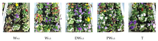 Viola × wittrockiana plants at the end of the trial. W9.0 is pure wastewater, EC 9.0 dS m−1, W4.5 is diluted wastewater, EC 4.5 dS m−1, DW4.5 is depurated wastewater, EC 4.5 dS m−1, PW4.5 is phytodepurated wastewater, EC 4.5 dS m−1 and T is tap water, control, EC 1.5 dS m−1.