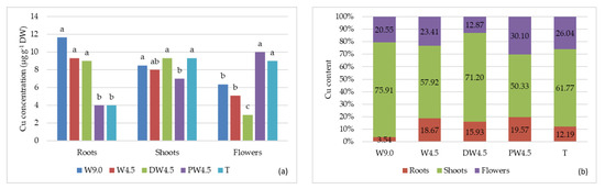 The greatest total Cu content (Table 3) was seen in the DW4.5 plants (12.66 µg plant−1), followed by the control plants (12.37 µg plant−1) and the PW4.5 plants (11.94 µg plant−1). The plants irrigated with pure wastewater accumulated significantly less Cu in roots (0.24 µg) than with the other treatments, which is directly related to the low dry matter of this organ. The Cu accumulation in shoots was significantly higher in DW4.5 (1.72-fold greater compared to W9.0), while it increased significantly in the PW4.5 treated flowers (3.59 µg), which showed no significant differences in relation to the control (3.22 µg). The organ which extracted the most Cu was the shoots (Figure 2b), ranging from 50.33% in PW4.5 to 75.91% in W9.0.