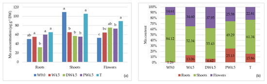 Plants irrigated with tap water extracted much more Mn (Table 4) (141.20 µg plant−1) than plants subjected to the other treatments (83.87−111.10 µg plant−1). When compared to W9.0, phytodepuration significantly increased Mn accumulation in the roots, but there were no significant differences in relation to tap water. All the treatments using pure wastewater led to a decrease in the Mn content in the shoots; although the shoot Mn content was higher in P plants (86.60 µg) compared to W9.0 plants (70.56 µg), the differences were not significant. In the flowers, the Mn content was the highest in the plants treated with depurated wastewater (42.17 µg), and W9.0 was the treatment that led to the lowest content (12.25 µg). Manganese was stored mainly in the shoots, with a minimum Mn content of 49.29% with the treatment with phytodepurated water (Figure 3b) and a maximum of 84.12% with pure wastewater.