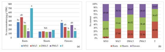 The treatment that caused the greatest reduction in the Fe concentration (Figure 4a) in the roots in relation to the control (705.00 µg g−1 DW) was PW4.5 (4.43-fold). In the shoots, there were no significant differences among treatments, ranging from 139.50 to 186.00 µg g−1 DW. The highest Fe concentration in the flowers was detected in the plants treated with pure wastewater (356.67 µg g−1 DW), although there were no significant differences in relation to PW4.5 and W4.5 (305.00 and 257.50 µg g−1 DW, respectively).