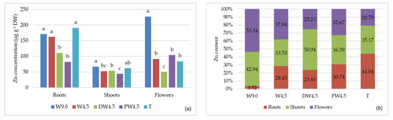 When tap water was applied, the plants extracted the greatest amount of Zn (145.25 µg) (Table 6), followed by diluted wastewater, depurated wastewater, phytodepurated wastewater, and pure wastewater, reaching values of 120.77, 110.74, 104.56 and 102.01 µg plant−1, respectively. As far as the Zn content in roots is concerned, it showed the greatest value in the control plants (63.97 µg), being 1.99-fold, 2.42-fold, and 1.86-fold greater in relation to phytodepurated, depurated and diluted wastewater, whereas the content for W9.0 roots was extremely low (3.59 µg). Zinc accumulation in shoots attained the lowest levels with PW4.5 (38.26 µg), W4.5 (40.70 µg) and W9.0 (43.80 µg), with no significant differences among treatments. In flowers, the Zn content was clearly higher with the treatments W9.0 (54.61 µg) and W4.5 (45.70 µg) compared to PW4.5 (34.16 µg) and T (30.19 µg), with the differences being significant. Zinc was stored mainly in shoots in the DW4.5, PW4.5, and T treatments (Figure 5b).