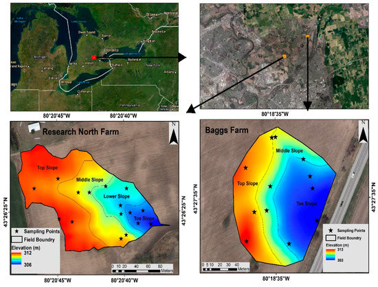 A field experiment was conducted at two agricultural farms with undulating landscapes (Baggs farm and Research North farm) near Cambridge, Ontario, Canada. Baggs farm is located at 43° 27′ 35′′ N, 80° 18′ 35′′ W, and Research North is located at 43° 26′ 25′′ N and 80° 20′ 45′′ W. The soil texture at Baggs farm and Research North is sandy loam (sand:silt:clay = 59 ± 5:32 ± 4:8 ± 4) and loamy sand (sand:silt:clay = 76 ± 2:18 ± 1:6 ± 2), respectively. According to Köppen climate classification, the area had humid continental climate. The total area selected for this study at Baggs farm was 1.22 ha while at Research North, the field scale watershed was delineated using digital elevation data measuring 2.21 ha. Lidar Digital Terrain Model Land Information Ontario data set was processed to obtain slope and topographical wetness index (TWI) in ArcGIS 10.6.1 (ESRI) and Pennock soil classification [58] was performed with System for Automated Geoscientific Analyses (SAGA-GIS) software, an open-source geographic information system software, available online at http://www.saga-gis.org/en/index.html). Initially, the selected area at each farm was divided into different topographical positions or clusters based on digital elevation model. Baggs farm was divided into 3 slope positions (toeslope, middle slope, and upper slope) with 4 sampling points in each position as replicates (total 12 sampling points), while Research North was divided into 4 slope positions with 4 sampling points in each position as replicates (total 16 sampling points) (Figure 1). Traditionally, replicates are randomly selected within a block (here slope position) assuming uniform soil conditions. However, spatial heterogeneity in soil properties within a block could increase the error. Therefore, we used conditional Latin Hypercube sampling (cLHS) design implemented in R statistical package to select 4 replicates within each slope position using available soil data (digital elevation, TWI, slope, and Pennock soil classes as covariates) to capture maximum spatial variation within each slope position.