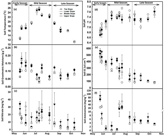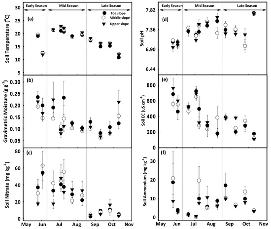 Temporal changes in soil temperature (a), gravimetric moisture content (b), nitrate (c), pH (d), electrical conductivity (e) and ammonium concentration (f) at Baggs farm. Scatter plots were prepared using mean values (Mean ± SEM) from four replications at each slope positions. Soil samples were collected during early season (26 May, 3 June), mid season (21 June, 4 July, 9 July, 23 July, 9 August) and late growing season (23 August, 9 September, 25 September, 10 October).