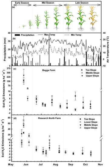 Corn growth seasons (a), weather conditions (b), and temporal patterns of Soil N2O emissions at Baggs farm (c) and Research North (d). Scatter plots were prepared using mean N2O emissions (Mean ± SEM) from four replications at each slope positions. Gas samples were collected from the Baggs farm during early season (26 May, 3 June), mid season (21 June, 4 July, 9 July, 23 July, 9 August) and late growing season (23 August, 9 September, 25 September, 10 October) and from Research North during early (22 May, 26 May, 6 June), mid (21 June, 5 July, 11 July, 18 July, 7 August), and the late growing season (20 August, 5 September, 24 September, 11 October). Image source [75].