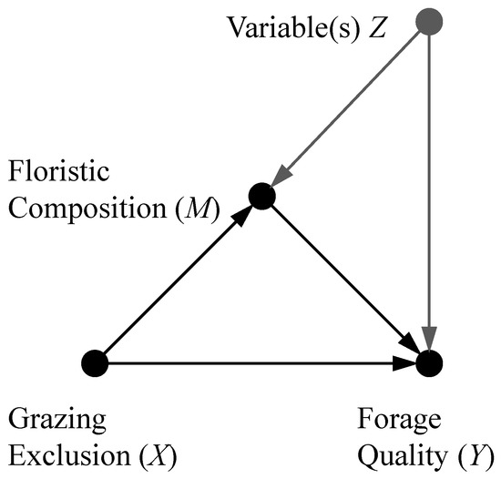 Directed acyclic graph representing direct and indirect (via concurrent change in floristic composition) effects of grazing exclusion (X) on forage nutritive quality (Y). Floristic composition acts as a mediating variable (M). The variable(s) Z denotes potential confounders of the mediator M and the outcome Y. Grazing exclusion (X) is a randomized experimental factor, and so stands as a parent node with no incoming arrows. The path from X to Y (X → Y) represents the direct effects and the path from X to Y through M (X → M → Y) represents the indirect effects, once that the potential confounding effects of the Z variables have been controlled for.