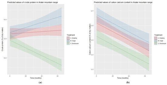Except for ash and Ca, the interaction between treatment and time was significant in all cases (Table 1 and Table 2), indicating that the effect of treatment on Mg, K, P, CP, NDF, and NDFcel depends on Time (Figure 2 and Supplementary Figure S3); main tests for time are not significant in many cases, which is due to the observed crossover interactions (Figure 2a and Supplementary Figure S3). Tukey’s post-hoc tests (Supplementary Table S3) indicate that the levels grazing-exclosure and cage-exclosure are significantly different in all cases but K, and also that the levels grazing-cage are significantly different only in the cases of Mg, K, and CP.
