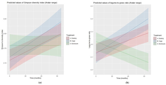 Simpson’s index of plant species diversity remained stable over time within the experimental exclusions, whereas it improved outside the exclusions (Figure 3a; Table 1 and Table 2), i.e., under grazing and cage levels of the treatment factor. By contrast, whereas the legume-to-grass ratio and the proportion of dicots deteriorated over time within the experimental exclusions, they also tended to improve outside the exclusions (Figure 3b and Figure S4; Table 1 and Table 2). The evidence for statistical difference between grazing and cage levels of the treatment factor, though significant for the legume-to-grass ratio, was, in general terms, weak (Supplementary Table S3).