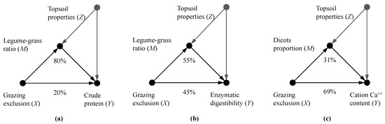 Direct (paths from X to Y) and indirect effects (paths from X to Y passing through M) of experimental grazing exclusion (X) on descriptors of forage nutritive quality (Y), once that topsoil properties (Z) have been taken into account. (a) Simultaneous change in the legume-to-grass ratio mediates 80% of change in crude protein content and, (b) 55% of change in enzymatic digestibility; (c) concurrent change in the proportion of dicots mediates 31% of change in cation calcium forage content.