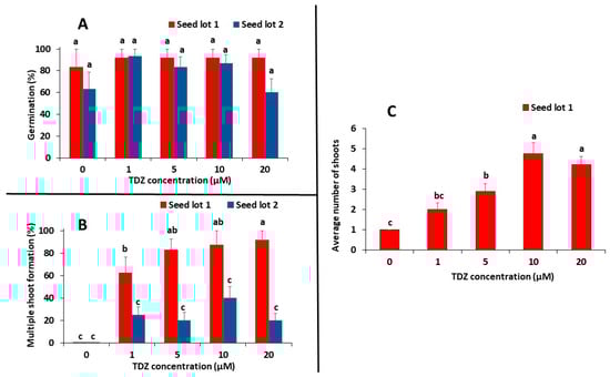 Seeds of both seed lots germinated in vitro with frequencies above 60% with no significant differences between the seed lots and TDZ concentrations in the medium (Figure 1A). In seed lot 1, germination on TDZ-containing medium was only 9% higher than on the control medium without TDZ. Germination of seed lot 2 increased from 63% on TDZ-free medium to 83–93% in the presence of 1, 5, and 10 µM TDZ but dropped to 60% at a higher concentration (20.0 µM).