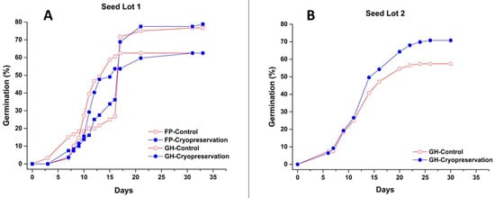 Figure 3. Germination percentage over 35 days under in vitro and greenhouse conditions for control and cryopreserved seeds of two different seed lots, seed lot 1 (A) and seed lot 2 (B) of Lupinus rivularis. FP—in vitro seed germination was performed on filter paper using 9 cm Petri dishes in the growth chamber; GH—seed germination was performed on soil substrate in the greenhouse.