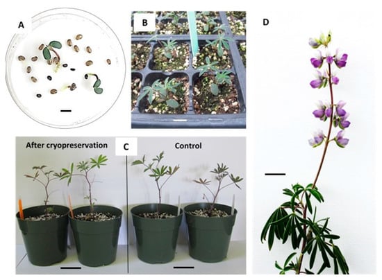 Figure 4. In vitro germination of cryopreserved seeds and growth of Lupinus rivularis on filter paper (A) bar = 1 cm; and in the greenhouse after three months (B) bar = 1 cm; Seedlings developed from cryopreserved and non-cryopreserved (control) seeds in the greenhouse after six months, bar = 3 cm (C); and flowering observed in the greenhouse after nine months (D) bar = 3 cm.