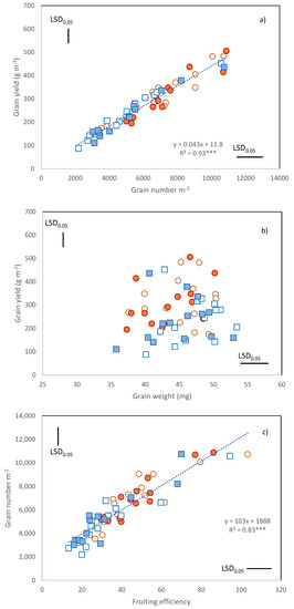 Relationships between (a) grain yield and grain m−2; (b) grain yield and grain weight; (c) grain number m−2 and fruiting efficiency. Data are C × Y × N means: orange circles, 2016; blue squares 2017; empty symbols, N46; filled symbols, N86. LSD0.05 for the comparison of cultivar means within each Year × N combination. ***, Pearson correlation coefficient significant at p ≤ 0.001.
