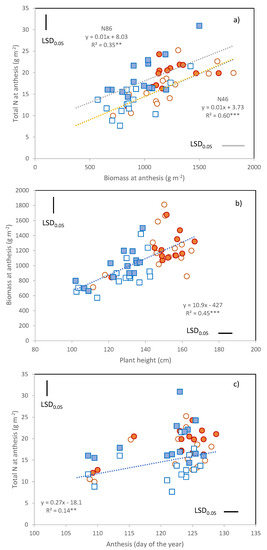 Anthesis sampling. Relationships between (a) Total N and biomass; (b) Biomass and plant height; (c) Total N and anthesis date. Data are C × Y × N means: orange circles, 2016; blue squares 2017; empty symbols, N46; filled symbols, N86. Separate regressions were calculated for the two N treatments in (a). LSD0.05 for the comparison of cultivar means within each Year × N combination. **, Pearson correlation coefficient significant at p ≤ 0.01; ***, Pearson correlation coefficient significant at p ≤ 0.001.