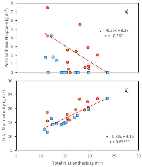 (a) Relationship between post-anthesis N uptake and N at anthesis; (b) Dependence of N present in crops at maturity on the N in the crop at anthesis. Data are C × Y means: Orange circles, 2016; blue squares 2017. Regression lines and equations refer to 2016 season. *, Pearson correlation coefficient significant at p ≤ 0.05; ***, Pearson correlation coefficient significant at p ≤ 0.001.