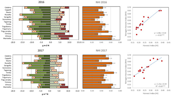 Left panel: N present in the crops at maturity. Negative values on the left-hand side of the y-axis are the amount of N remaining in the chaff (red-squared bars) and straw (green bars, with dark green representing the estimated structural N) at maturity. Positive values on the right-hand side of the y-axis, are the amount of N remobilised post-anthesis to the grain from the vegetative tissues (stems + leaves, green points) and from the ears (diagonal red lines), and the post-anthesis N uptake (red bars). Central panel: Nitrogen Harvest Index with LSD0.05 values for the comparison of cultivars; Right panel: relationship between NHI and HI. Data are cultivars means in 2016 (upper row) and 2017 (lower row). ***, Pearson correlation coefficient significant at p ≤ 0.001.