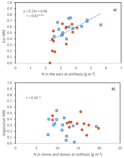 The ears were also the organs with the greatest decrease in N percentage between anthesis and maturity (from 2.13% to 1.01% on the average of the two years, Table 5) compared with that exhibited by leaves and stems (from 1.47 to 0.89%, Table 5). A positive relationship was found between N partitioned to the ears at anthesis and ear NRE (Figure 5, r = 0.61 ***), but not between N partitioned to vegetative tissues at anthesis and vegetative NRE.