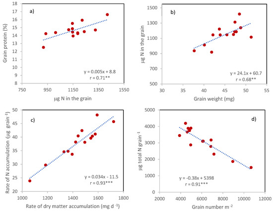 The differences between cultivars in grain protein percentage were not a consequence of the corresponding differences in grain weight since no relationship was detected between the two traits. Instead, they derived from the corresponding differences in the µg of N in the grain, being the two traits (grain protein percentage and µg of N in the grain) associated with r = 0.71 ** (Figure 6a). In turn, µg of N in the grain was positively associated with grain weight (r = 0.68 ***, Figure 6b), in agreement with the strong and positive correlation between the rates of dry matter and nitrogen accumulation in the grains calculated on the number of days between anthesis and maturity (Figure 6c, r = 0.93 ***).