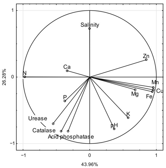 The PCA showed that urease activity was positively related to catalase and acid phosphatase activity and the content of assimilable phosphorus and total nitrogen in the soil. The urease enzyme activity is optimal at a pH of 6–7 [96]. As acidification increases, its activity significantly decreases. Bielińska and Żukowska [23] showed that soil urease activity correlated with C and N organic and N-NH4 content. On the other hand, a decrease in its activity was caused by a decrease in pH value and increased salinity and content of assimilable heavy metals such as Zn, Cu, Mn, and Fe. Telesiński [93] showed that salinity had a negative effect on urease activity. Furthermore, the inhibiting effect of increased amounts of heavy metals on the activity of this enzyme has been confirmed by other authors [24,98,99].