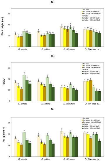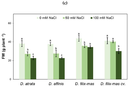 Effect of salinity on plant height (a), leaf greenness index (Soil Plant Analysis Development (SPAD)) (b) and fresh weight of the above-ground part (c) of D. affinis, D. atrata, D. filix-mas and D. filix-mas cv. Linearis-Polydactylon (D. filix-mas cv.). Data are mean ± SD. Different letters indicate significant differences for p ≤ 0.05.