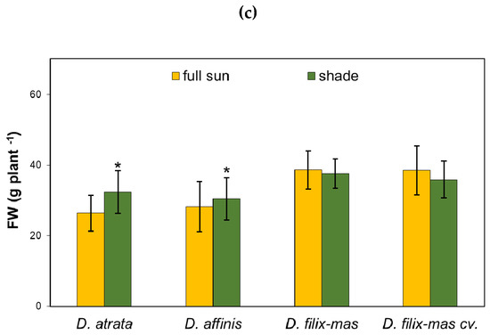 Effect of light conditions on plant height (a), leaf greenness index (SPAD) (b) and fresh weight of the above-ground part (c) of D. affinis, D. atrata, D. filix-mas and D. filix-mas cv. Linearis-Polydactylon (D. filix-mas cv.). Data are mean ± SD. Asterisks mark indicate significant differences for p ≤ 0.05.