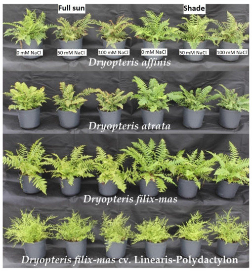 The effects of salt stress on plant height, leaf greenness index (SPAD), fresh weight of the above-ground parts (Figure 3a–c) and visual score (Table 4) depended on light condition and taxon. In D. atrata and D. affinis salinity reduced plant height considerably stronger in plants growing in full-sun than in shade. In D. filix-mas and cv. “Linearis-Polydactylon” NaCl only slightly diminished plant height under both light conditions. Exposure to both concentrations of salt resulted in a decrease of fresh weight of D. atrata, D. affinis and D. filix-mas in both light treatments, whereas D. filix-mas cv. “Linearis-Polydactylon” responded with a drop in fresh weight, both in the sun and in the shade, only to 100 mM NaCl. SPAD greenness index decreased in D. atrata and D. affinis with increasing concentration of NaCl both under full sun and shade treatments. In D. filix-mas, its salinity-triggered reduction was only perceived in low light intensity. In salt-exposed D. filix-mas cv. “Linearis-Polydactylon” plants SPAD value declined in the shade but grew in the sun. Control (no salt) and shaded plants of D. atrata, D. affinis and D. filix achieved the highest visual score. In D. filix-mas cv. “Linearis-Polydactylon” the most decorative plants were those growing without NaCl pressure in the full sun. Interestingly, we found no leaf discoloration or necrosis in D. filix and D. filix-mas cv. “Linearis-Polydactylon” exposed to salt under both light conditions. Salt-exposed plants of D. atrata and D. affinis responded with leaf margin chlorosis and necrosis, particularly at 100 NaCl mM and under full sun (Figure 4).