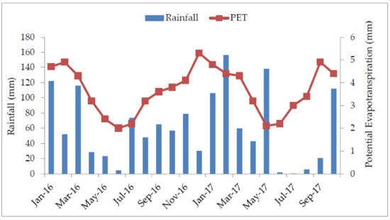 The total amount of rainfall received during the study period was 1343.9 mm. However, there was a huge difference among seasons in terms of rainfall (Figure 1). In the 2016 season, the study site received 590.2 mm, which was lower than the 753.7 mm recorded in 2017. The total rainfall in 2016 was lower as compared to the mean annual rainfall of 900 mm in the study site, while rainfall in 2017 was slightly lower. The highest (5.3 mm) and lowest (2.0 mm) potential evapotranspiration was recorded in December and June 2016, respectively (Figure 1).