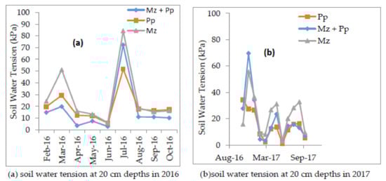Soil water tension (SWT) changes are normally affected by rainfall. During the study period, low SWT values were observed during rainfall events; Bullied and Entz [] also found a similar tendency of low SWT during rainfall events. The lowest amount of soil water stored in the 20 cm profile in each treatment was recorded in June 2016, and June and July 2017, which coincided with the low rainfall amounts received in those months. Furthermore, variations were more prominent on the 20 cm soil layer, which might have been attributed to water abstraction by crop and evaporation. These results agree with those of Asbjornsen et al. [] and Wang et al. [], where most water uptake by crops was observed in the 0–50 cm soil profile. Also, since water does not settle in one profile of the soil but moves further down, more water was anticipated at the 120 cm depth, which did not respond much to rainfall events and remained saturated. Seasonal variability had an effect on the WU values experienced during the study period. WU values observed in 2017 were approximately 1.3 times higher in treatments containing pigeonpea and 1.8 times higher in sole crops than those recorded in 2016. Our study agrees with Lenga [], who reported differences in WU values in different seasons. Pigeonpea + maize and sole pigeonpea recorded similar values of WU, which were higher than sole maize in both seasons. This partly agrees with Chirwa et al. [] who found no significant differences in WU on agroforestry systems involving maize, pigeonpea and Gliricidia sepium.