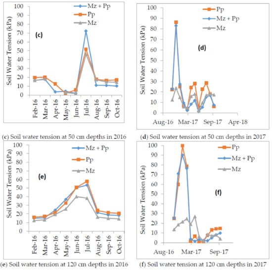 Soil water tension within treatments (Mz = maize, Pp = pigeonpea, Mz + Pp = maize + pigeonpea) across three soil depths.
