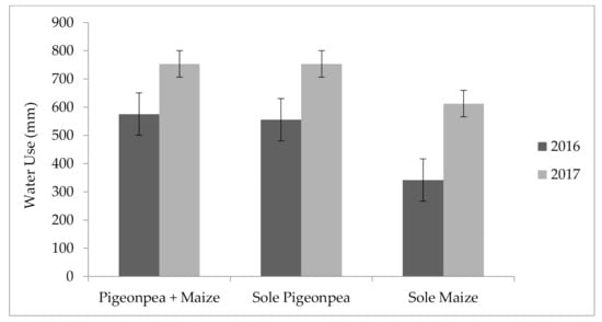 Significant difference was observed in total seasonal water use in 2016, where sole pigeonpea and pigeonpea + maize recorded similar values that were higher than sole maize in both seasons (Figure 3). The WU values in 2016 ranged from 342 mm to 576 mm, while in 2017, they ranged from 613 mm to 754 mm. Sole maize recorded the lowest WU values across both years (342 mm in 2016 and 613 mm in 2017) (Figure 3).