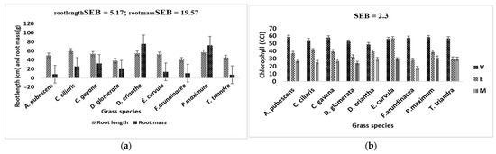 Effect of grass species on root length (cm) and root weight (g) (a) and chlorophyll content index (CCI) (b), of nine selected grass species at maturity stage. V = vegetative stage; E = elongated stage; M = maturity stage. SEB = standard error bar.