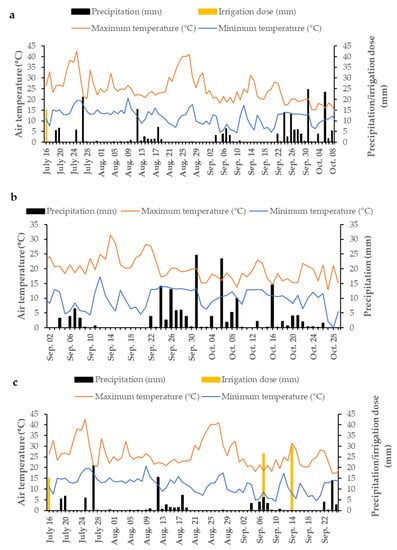Daily rainfall, irrigation and average minimum and maximum air temperatures during the experimental period of experiments 1 (18 July–8 October 2019) (a), 2 (2 September–29 October 2019) (b) and 3 (18 July–24 September 2019) (c).