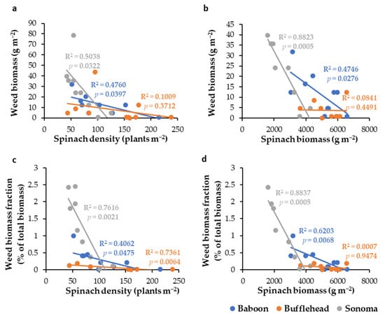 Linear relationships between (a) weed biomass and spinach density (b) weed biomass and spinach biomass, (c) weed biomass fraction and spinach density, and (d) weed biomass fraction and spinach biomass for hybrid spinach cultivars ‘Sonoma’ (solid grey line), ‘Bufflehead’ (solid orange line) and ‘Baboon’ (solid blue line) (experiment 1).