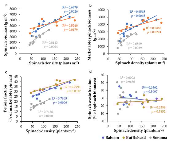 Linear relationships between (a) spinach biomass, (b) marketable spinach biomass, (c) spinach petiole fraction and (d) spinach waste fraction on the one hand and spinach density on the other for hybrid spinach cultivars ‘Sonoma’ (solid grey line), ‘Bufflehead’ (solid orange line) and ‘Baboon’ (solid blue line) (experiment 1).