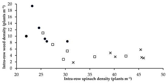 Among narrow- and wide-row systems without intra-row weeding, the system with narrow row spacing showed significantly highest weed biomass. At the same seeding rate, a narrow-row system has a lower intra-row spinach density and lower intra-row weed suppressive ability, as intra-row weed numbers significantly decreased with increasing intra-row spinach density (Figure 4). Hence, decreasing intra-row spacing is important for reducing weed biomass in systems without intra-row weeding. For systems without intra-row weeding, spinach biomass was not affected by row spacing system. Tei et al. [4] also found no effect on spinach yield when row spacing was doubled from 12.5 to 25 cm while keeping seeding rate constant (460 seeds m−2). In contrast, Peruzzi et al. [1] obtained significantly higher spinach yield in a single-row system with 20 cm row spacing than in a single-row system with 25 cm row spacing; but here, spinach density was 50% greater in the narrow-row system.