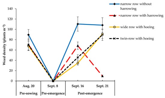 Time course of weed density (mean ± SE) in four plant spacing management systems (experiment 2). Counting dates: 20 August, before seedbed preparation; 8 September, before pre-emergence flaming; 16 September, before first harrowing pass; 21 September, before second harrowing pass.