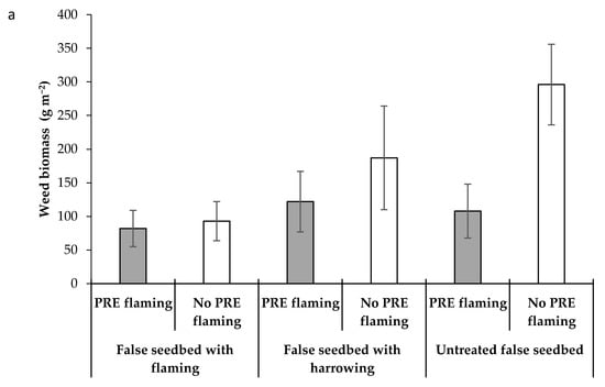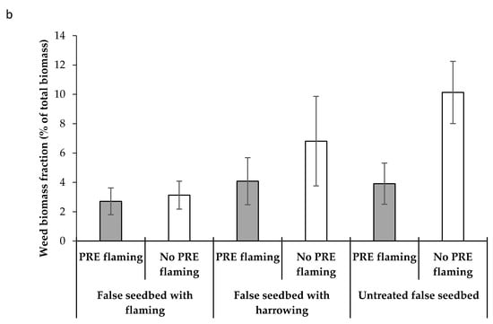 Overall, lowest weed biomass and weed biomass fractions were obtained in plots with flaming applied on false seedbed and/or pre-emergence followed by two harrowing passes in post-emergence (Table 5).