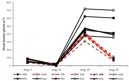 Time course of weed density (mean) in 12 weed control strategies in a single-row system with 10.5 cm row spacing (experiment 3). Counting dates: 5 August, before the first false seedbed operation; 12 August, before pre-emergence flaming; 19 August, before the first harrowing pass; 22 August, before the second harrowing pass. Strategies are given by a three-digit code: first digit for false seedbed treatment, second digit for pre-emergence treatment and third digit for post-emergence treatment. Treatments comprised harrowing (h), flaming (f) and no treatment (n).