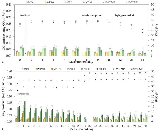 The course of CO2 emission in the laboratory experiments: (a) tillage experiment and (b) fertilizer experiment. Different fertilizer doses: MP0, 80, 160; NT 0, 80, 160 kg ha−1 in mouldboard ploughing (MP) and no-tillage (NT), respectively. SWC—soil water content.