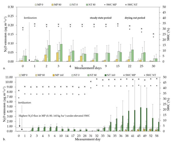 N2O emission and soil water content (SWC) in (a) Tillage experiment and (b) in Fertilizer experiment. Different fertilizer doses: MP 0, 80, 160; NT 0, 80, 160 kg ha−1 in mouldboard ploughing (MP) and no-tillage (NT), respectively.