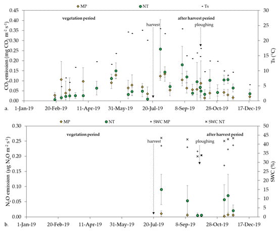 The annual course of CO2 emission showed an increasing trend in the first part of the vegetation period until the end of May, then decreased during ripening till harvest in both MP and NT treatments. A secondary emission peak occurred in the after-harvest period with a decline in fall and winter (Figure 3a).